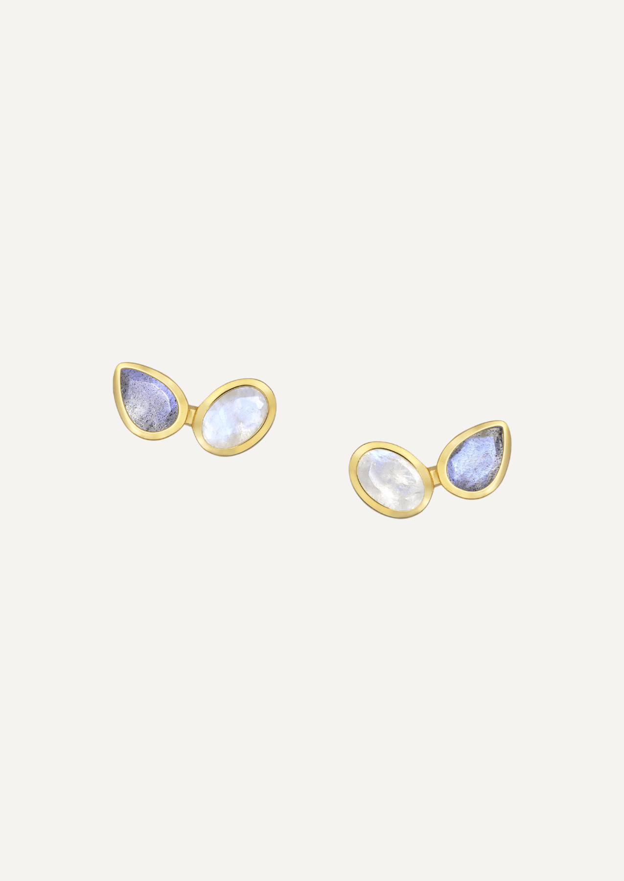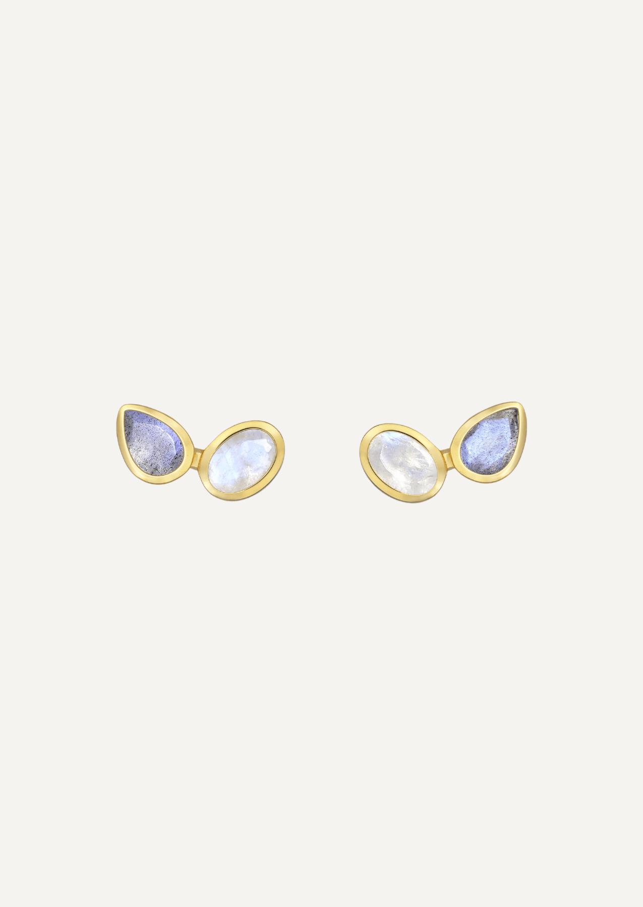 The Lunara Earrings with moonstone and labradorite trace the soft shimmer of lunar light. Each stud pairs two stones - one moonstone, one labradorite - joined in sculpted 18ct gold vermeil.