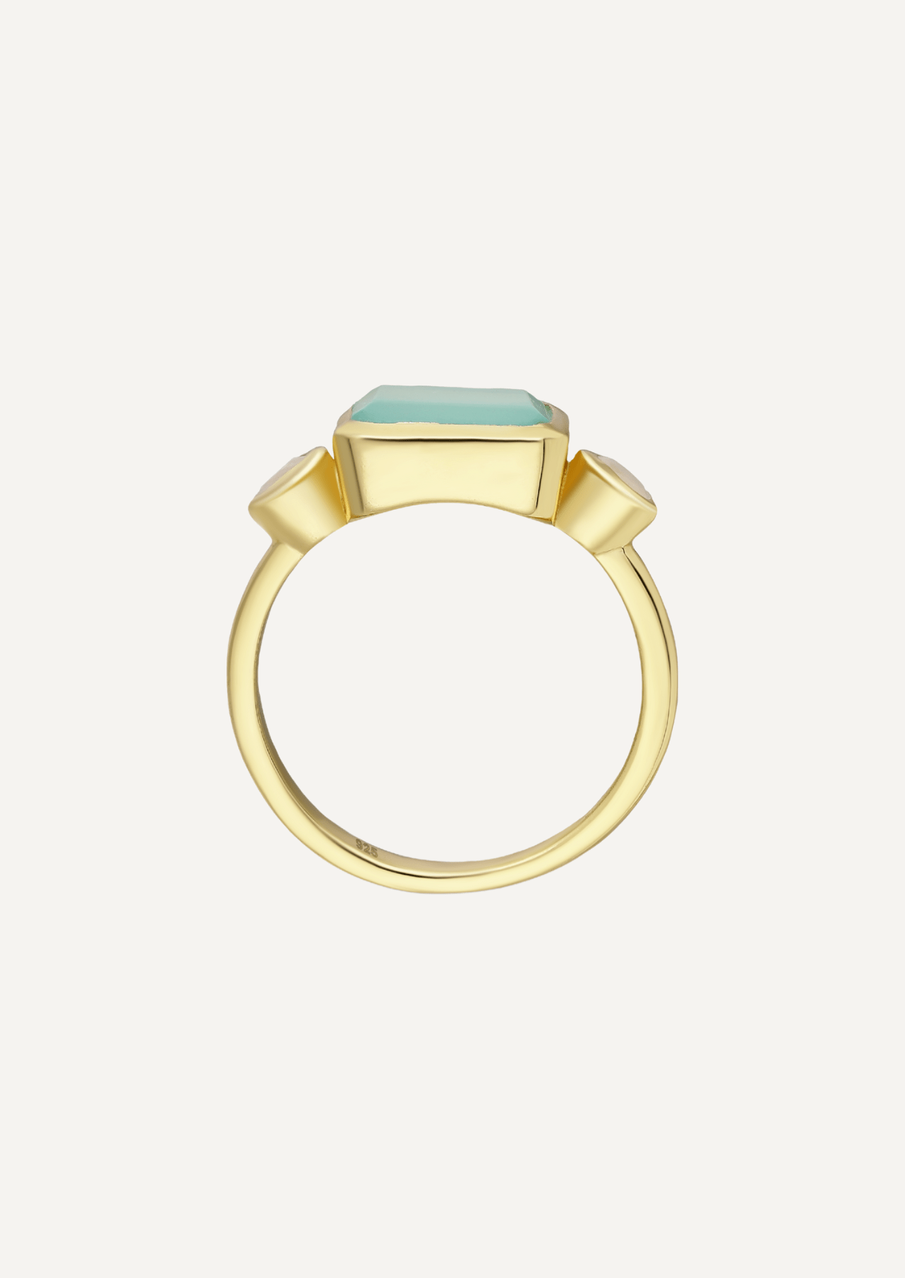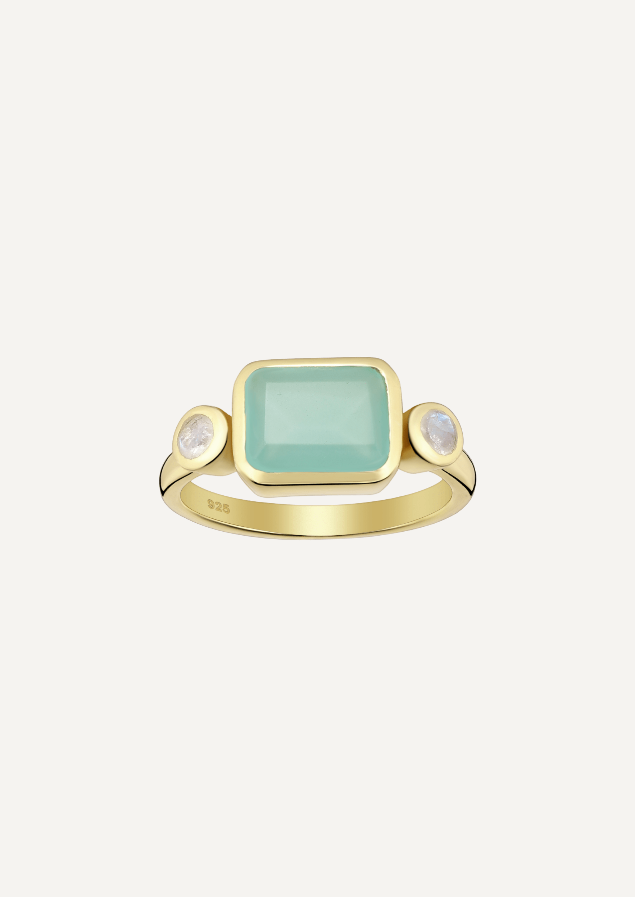A central aqua chalcedony glows between twin moonstones, each set in rounded bezels of 18ct gold vermeil. The gentle curve of its form feels deliberate and serene, with gold following the line of light across the hand.
