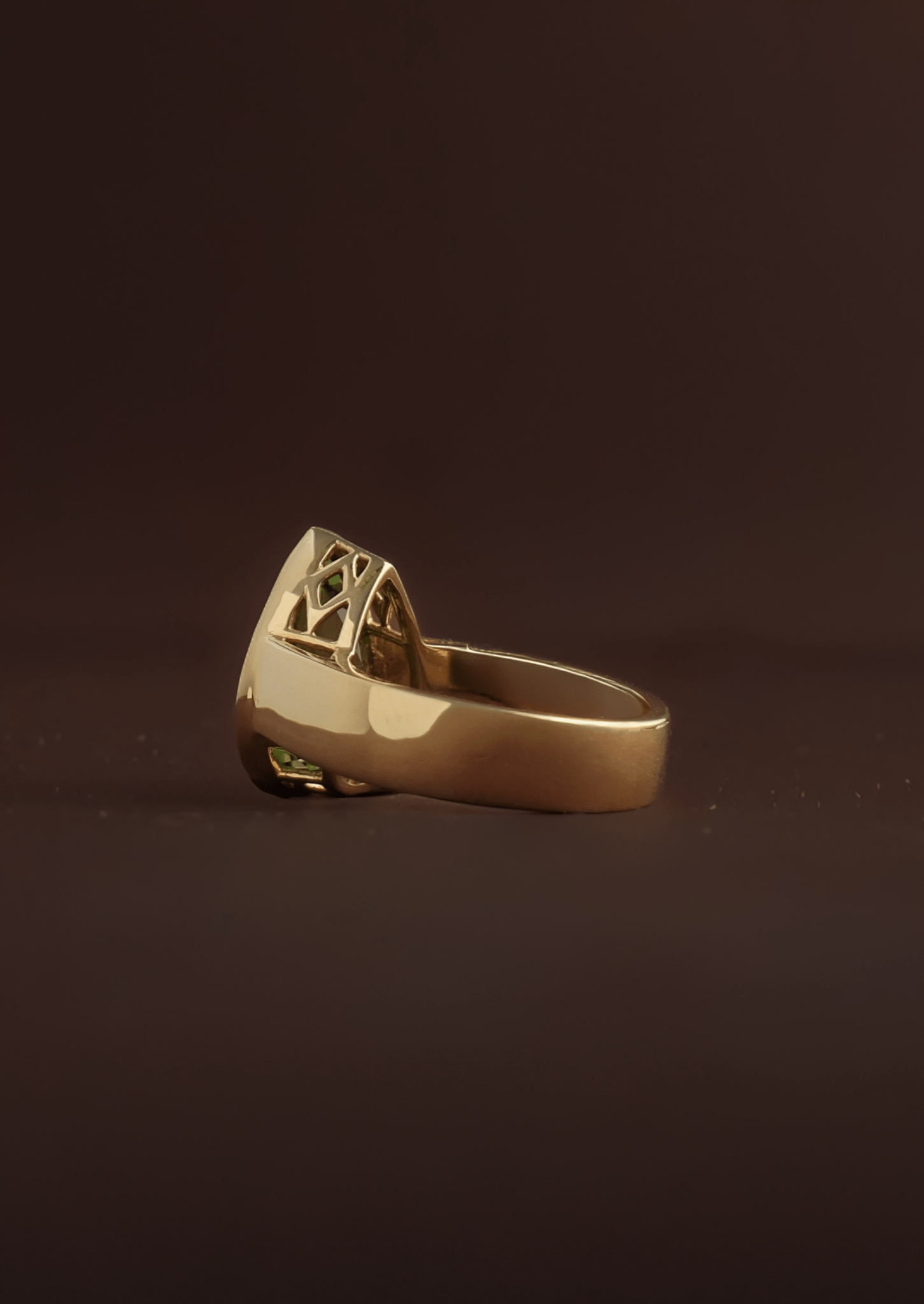 At its centre sits a brilliant green pear cut tourmaline, bezel set to protect the stone’s edge while allowing its internal geometry to remain fully legible. The bezel flows into a sculpted 9ct yellow gold form, grounding the scale of the gemstone with quiet authority.