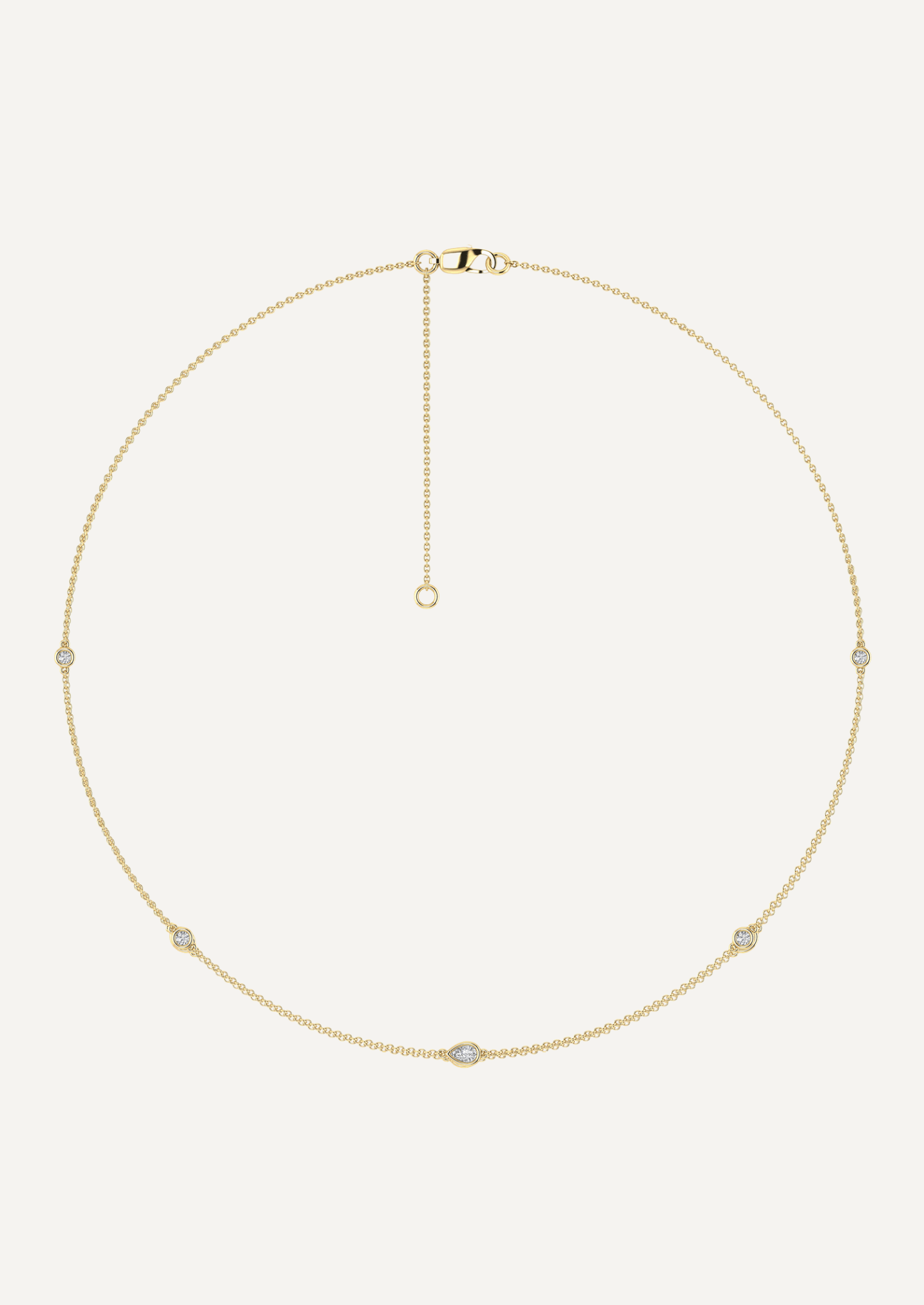 Adjustable between 40–45cm, the necklace rests gracefully along the neckline. The pear cut, long associated with grace and renewal, anchors the design with subtle symbolism, while the round cuts add constancy and light.