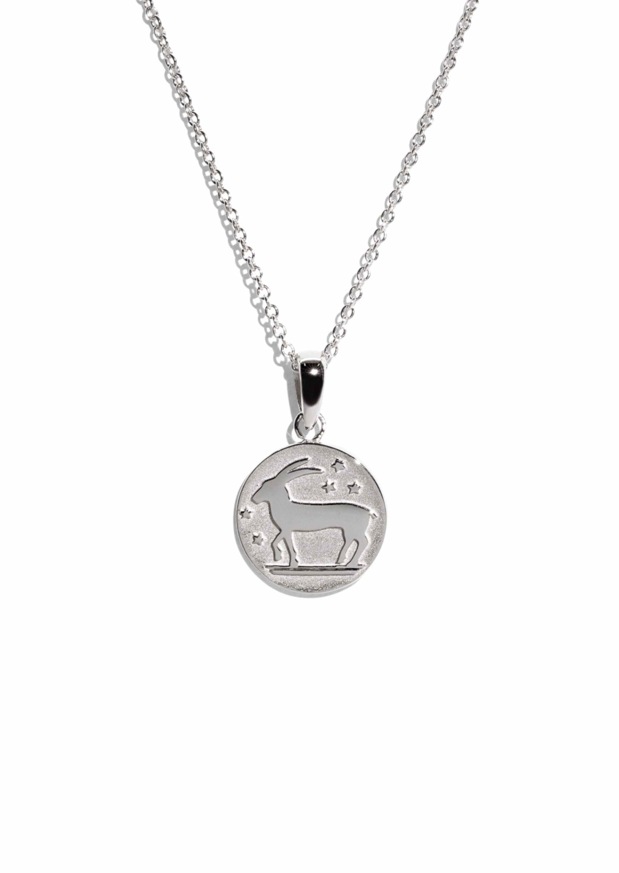The Silver Zodiac Pendant Necklace features an otherworldly zodiac motif.