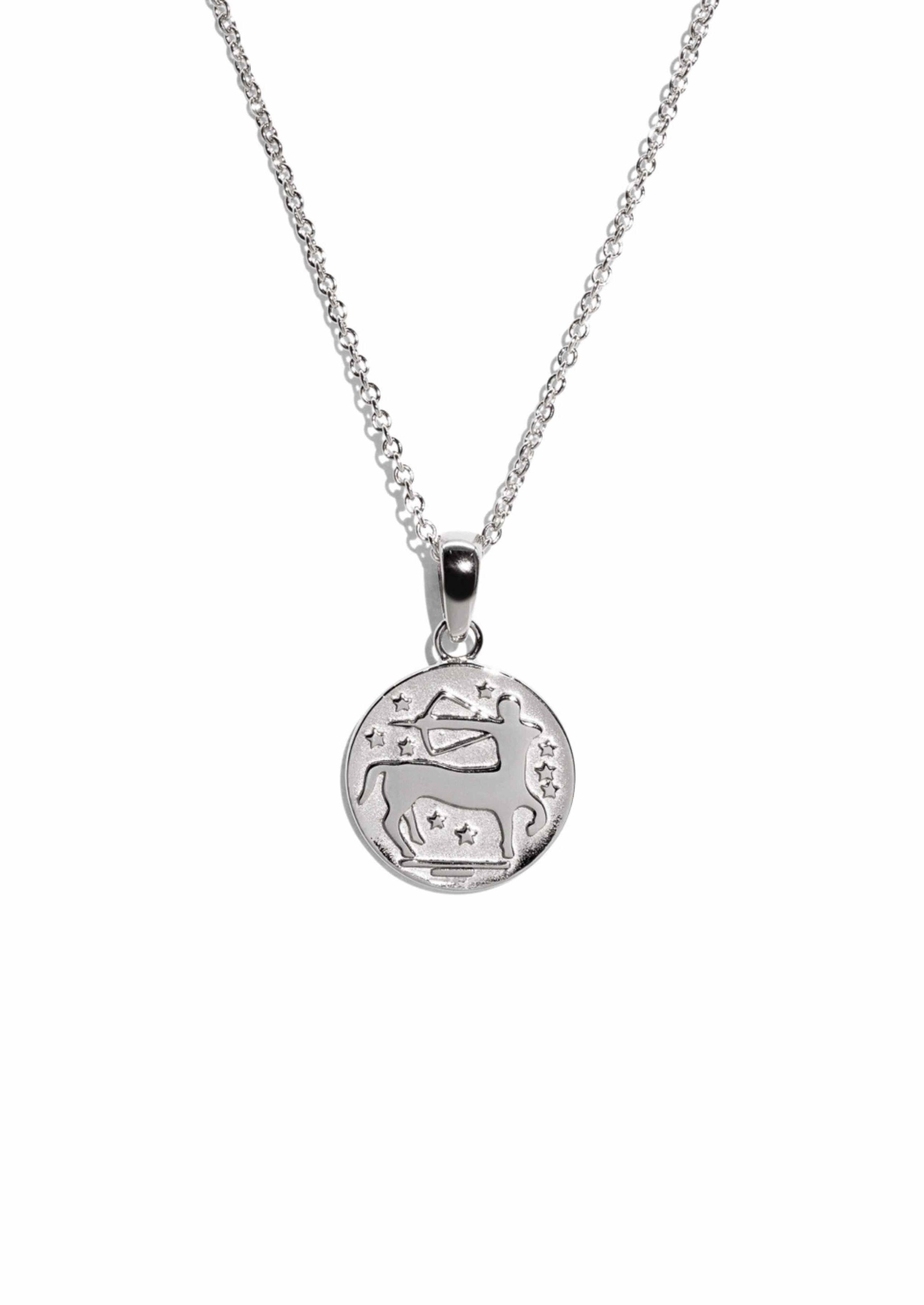 The Silver Zodiac Pendant Necklace features an otherworldly zodiac motif.