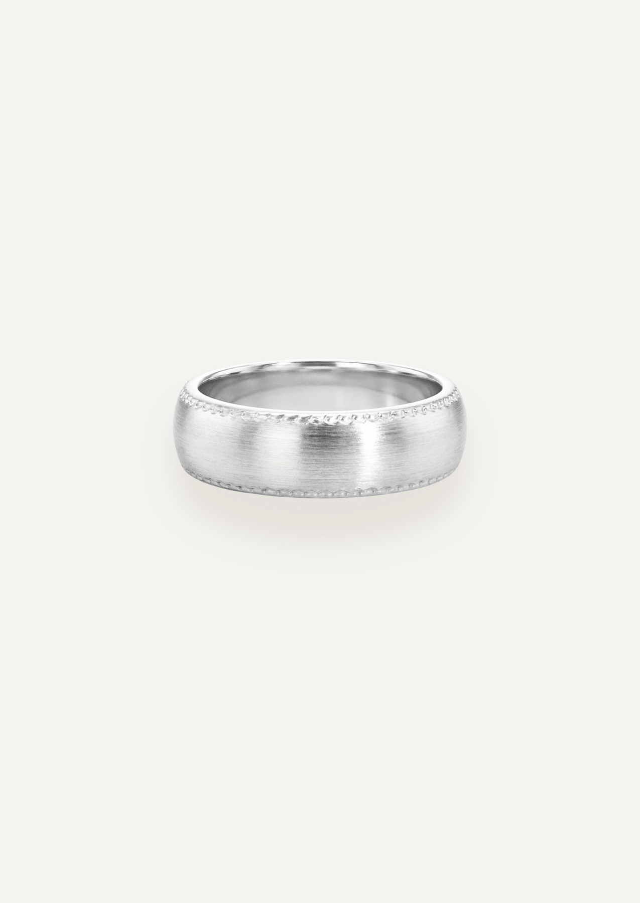 Its flat, gently curved surface and refined milgrain edges echo the original design while offering a stronger profile that sits solidly on the finger. Polished to a luminous shine, the band balances striking visual impact with everyday comfort, making it ideal for hands-on wear.